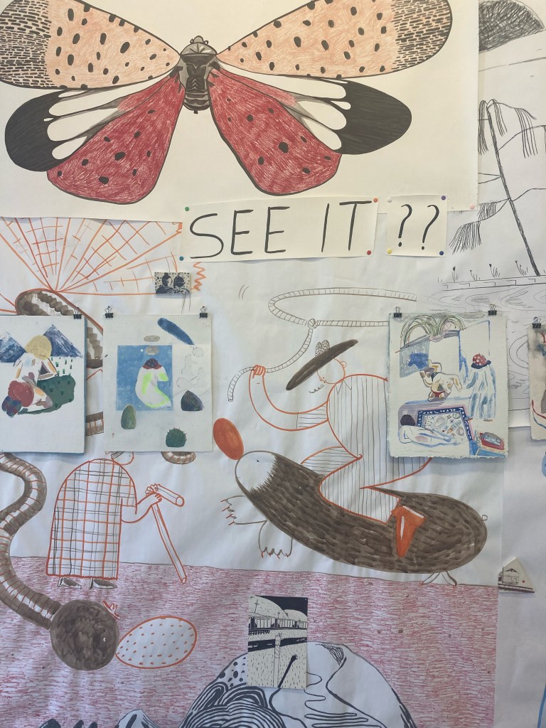 The most recognizable image in Phillips’ sensemaking narrative is the lanternfly, at the first corner of the room, decorated with a question: SEE IT?