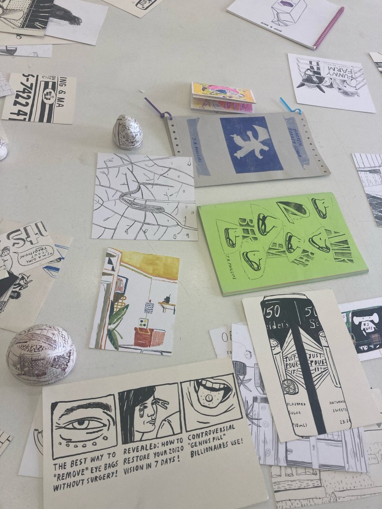This is a different kind of review I’m calling a “highlight,” a bite-sized recap of something I saw and liked. This week, I got the opportunity to view Juliet Phillips’ GET OUT FROM UNDER THE ROCK at Pullproof Studio (5112 Penn Ave) before its closing on September 22. Phillips and I are both native New Yorkers and bonded over both loving and losing New Golden Fried Dumplings, a now closed greasy hole-in-the-wall where you could buy a platter of dumplings for three bucks. It’s fitting that she and I connected over the shared memory of a commercial space, because much of Phillips’ work draws from how advertising and popular culture make up our consciousnesses. I first saw her whimsical use of color, which reminds me of the films of Wong-kar Wai or the photography of Petra Collins, at Bottom Feeder Books in Point Breeze. It’s sweet and nostalgic, playful and a little bit foreboding.