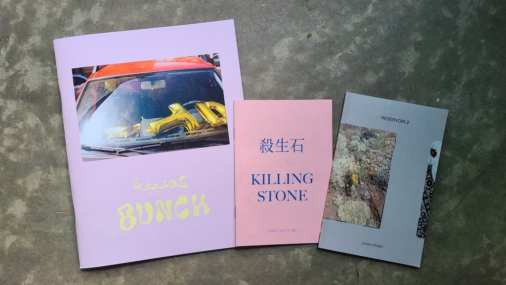 After hearing Homie House Press’s Adriana Monsalve speak during the podcast panel, I pick up Noura Tafeche + Caterina Ragg’s BUNCH | ﻋﺼﺒﻴـة, which collects five years of protests and disruptions that center balloons. Killing Stone is a zine by Eriko Hattori that I’ve seen in part on Instagram. It’s great to have a copy and admire Hattori’s intricate line work and the saturated colors of publisher Misfeed Press’s risograph printer. I also swipe up Micah H. Weber’s Reservoir-2, published by Cucuy.Studio. A disclaimer on the copyright page reads, “a constellation of collage, biography, and worrisome theory.” Being a fan of Weber’s films and sound design, I’m excited to dig into this one.