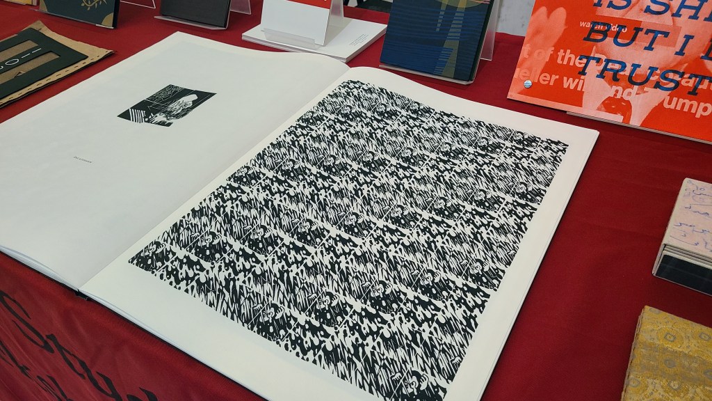 Here in the Hall of Sculpture at Carnegie Museum of Art, there is a hum of chatter and footsteps. A sizable crowd is circling a dozen plus long tables tended by artists, publishers, and booksellers. Photobooks, art books, accordion-style sculpture-as-book, risograph prints, and screen printed collections pop against the uniformly black tablecloths. There’s also pamphlets and zines. Cassettes. Photographs. There is an order to the layout of the fair. Somebody thought this through. The aisleways are spacious, but not stark. I can move freely from vendor to vendor without stress. Happily, there’s no soundtrack beyond the guests and vendors, allowing for easy conversation. But before I can browse, I head to the museum’s theater for the first of three panels.