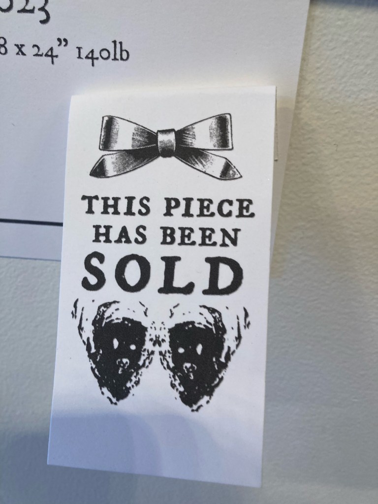 Perfectum’s approach of self-promotion and mixed media merchandise seemed to work. He used a wide distribution of physical fliers to promote the show and fill the gallery, and while I was in the exhibition space one gallerygoer mentioned she had come from a flier in the cafe Biddle’s Escape. Perfectum sold a decent amount of his catalogue, including the large work Observation Hour Over Desolation and a wide range of prints, limited editions, and merchandise. Plus, every time a piece sold, it didn’t just get a red dot on the wall but instead an artistically rendered tab sticker designed by Perfectum himself letting people know This Piece Has Been Sold. His multimedia background in industrial music, graphic design, and poetry means he is a master at being intentional about space and presentation. For Perfectum, every detail matters. He’s even intentional about the frames each painting goes into. Some have intricate gold antique frames while others are small and minimalist, but none are the type you’d simply find at the craft store.