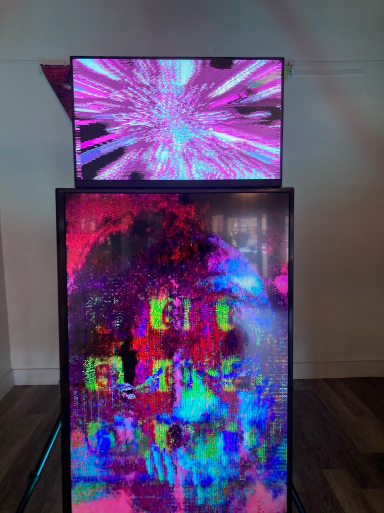 I went to look at Technicolor Hellscape and view the video installation component of the exhibit on Rosh Hashanah. In Judaism, there is no hell, but going from synagogue to Technicolor Hellscape made for a pretty unique viewing experience. That contrast made me think more deeply about the questions Perfectum was engaging with. Do we waste our lives waiting for something better to come along in the next one? How can we ever stay in the moment and have empathy for others when all we can really know and control is ourselves? Sartre declared l’enfer, c’est les autres—hell is other people. But “I Saw A Hellscape,” Perfectum’s video installation, postures that hell might actually be us. Perfectum digitally modified his voice to a metal-singer rasp, and as you approach the grainy, VHS-like screen the entity appears on, it demands a sacrifice, then eventually says “I looked inside of you…and I saw a hellscape.”