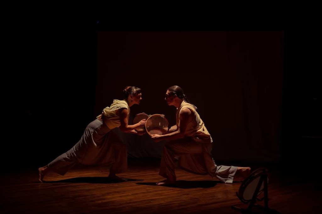 The performance is steeped in ritual or at least the semblance of it. Shared movements and rhythms imply shared knowledge. Roduta and Copeland play in unison, then in interlocking rhythms, then in unison again. The work ebbs and flows. At one point, they yelp and parallel the drum rhythms with their voices. Later, they crash thick, wooden sticks onto metal gongs and plates at expert speeds, sending smaller metal objects dangerously close to the edge of the table. Halfway through the piece, there is a song – the beautifully-sung Irish traditional, “Samhradh Samhradh,” a song that dates back to the mid-1600s (or 1730s, depending on your source) and was more recently popularized by the band The Gloaming. And sometimes there is silence.
