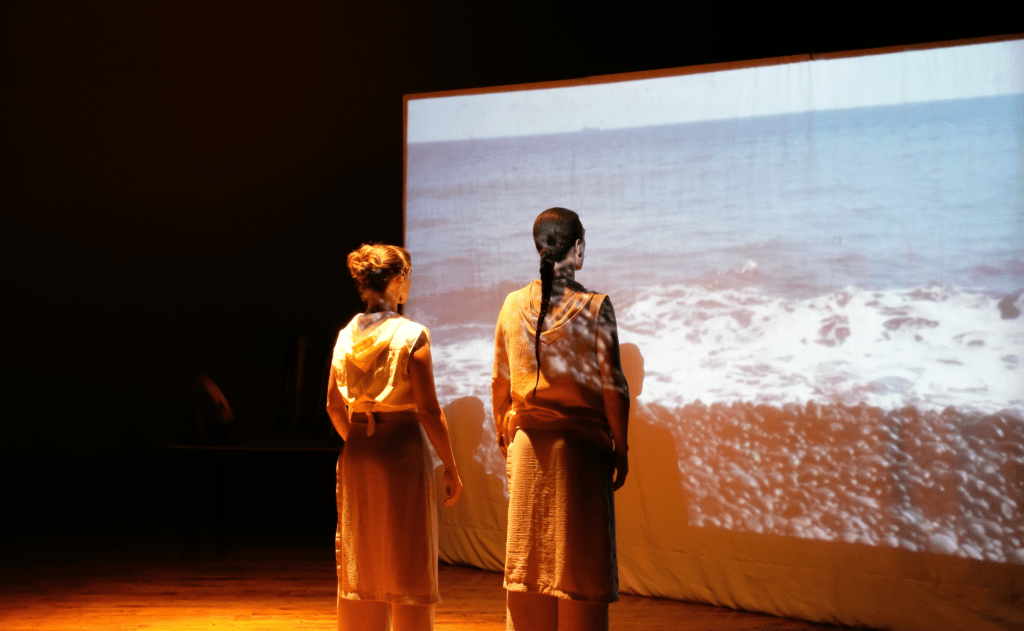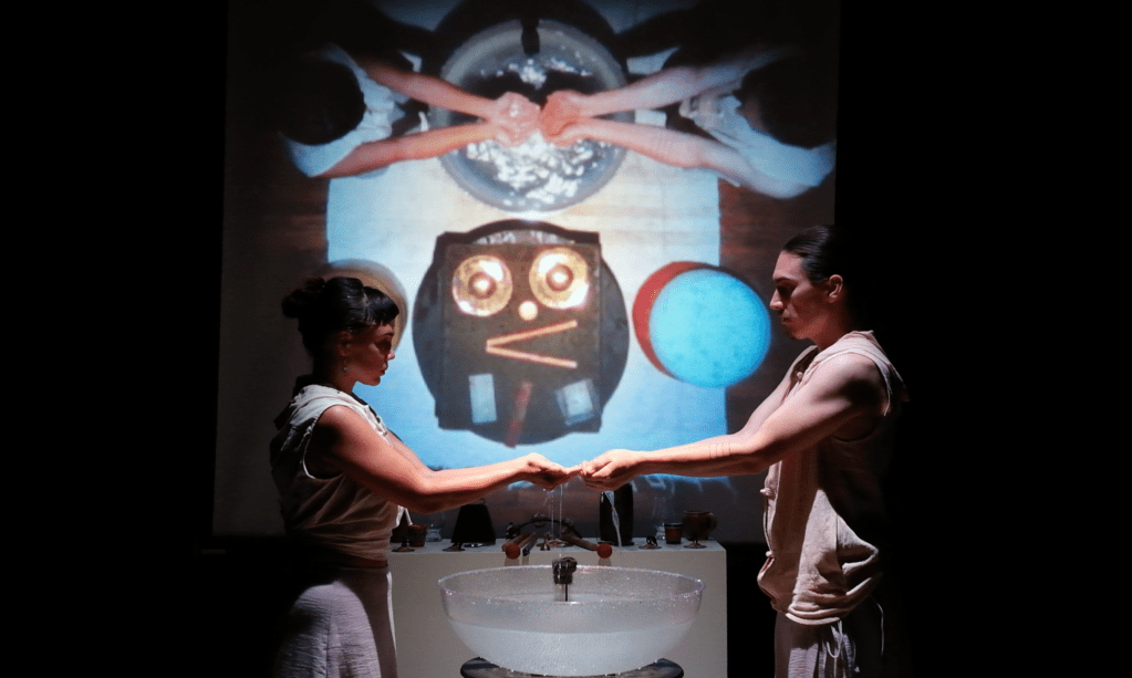 Percussion is front and center in Terra Bubo, an evening-length multimedia piece that for roughly 65 minutes presents a series of rhythmic scenarios – dialogues, maybe, paired with movement – that are interspersed with video and field recordings. Roaming across a series of minimal sets, the duo performs a marathon of complicated rhythmic patterns, all completely memorized, played on tamburello, bones, bodhran, gongs, and objects submerged in water.