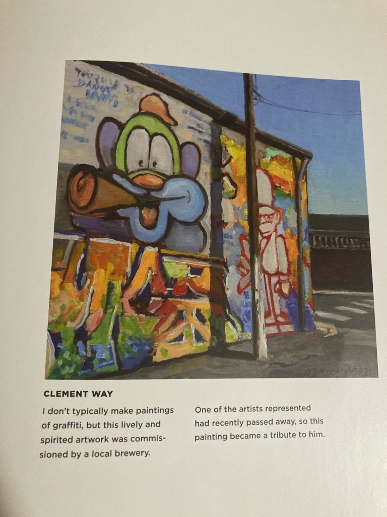 In his depiction of Clement Way in Bloomfield, Donoughe painted the graffiti on the permission wall of Trace Brewing in memory of the late Danny Devine—as someone tapped into the graffiti scene, there was something sweet about seeing plein air and graffiti overlap in a way they might not, usually.
