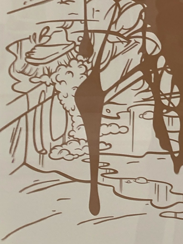 To describe the work as monochrome ochre against a white backdrop makes it sound simple, when it’s anything but. There’s the suggestion of domestic space, a bathroom or kitchen caught in harsh morning light. Is that a bed in the lower left corner or a sink? An oven door in the upper right, or a television set? An opaque blotch, the absence of line, or such a multitude of lines that they’ve congealed, obliterates the focal point. Soap suds or egg yolks, wigs or clouds of steam, emerge only to melt away again. These forms, tenuous as they are, don’t strictly consist of paint, but painted paper cutouts, not quite flush with the backdrop so that, when viewed from an angle, they cast discernable shadows.