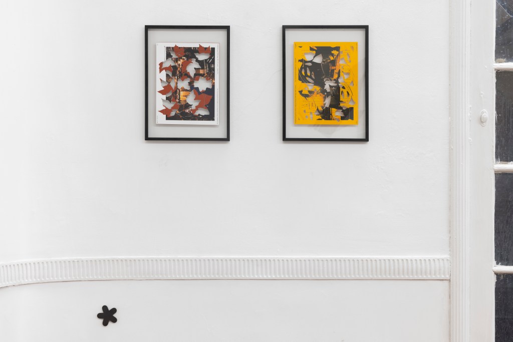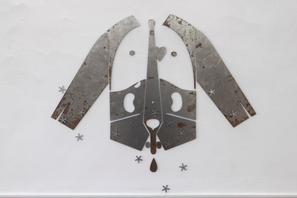 The strongest of Reitman’s works are the steel and rare earth magnet Sinus Diagram (2020) and Winter Jacket (2024). Winter Jacket leaves a single metallic leaf at its periphery, perhaps a nod to Guy’s leaves. Both use metal and magnet as nods to the shape of the human body, with kidneys and a heart. Small spots of rust along the steel soften the work—I found myself standing in front of Winter Jacket for longer than I anticipated to, taking in its shape. There’s an irony in creating a garment of warmth made out of metal.