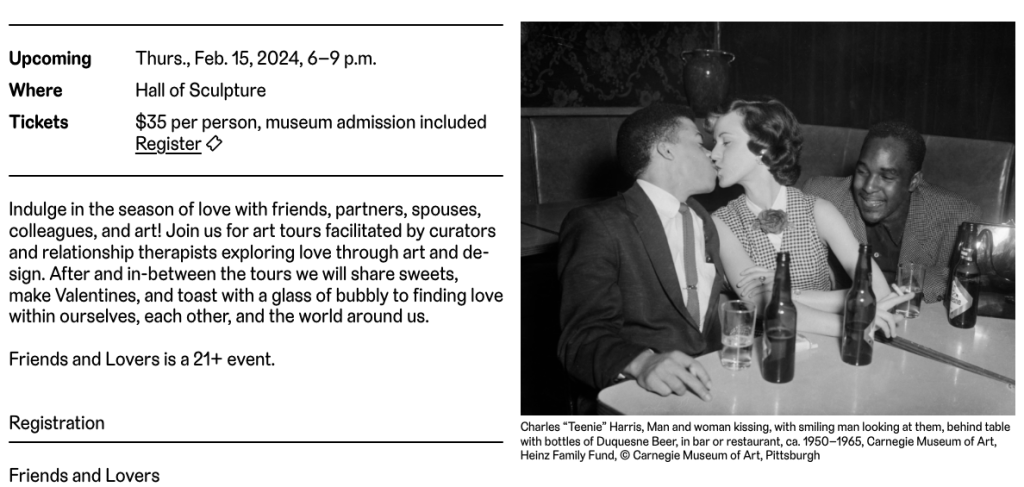 For the spring, if you are so inclined, the Carnegie Museum of Art has a “Friends and Lovers” event that boasts a tour facilitated by both “curators and relationship therapists.” I’m honestly curious who they’re bringing in as a relationship therapist to the Carnegie Museum—maybe they know that it’s only truly messed up people that decide to become involved in the arts. For everybody in the doghouse out there, maybe this is what will finally fix your relationship.