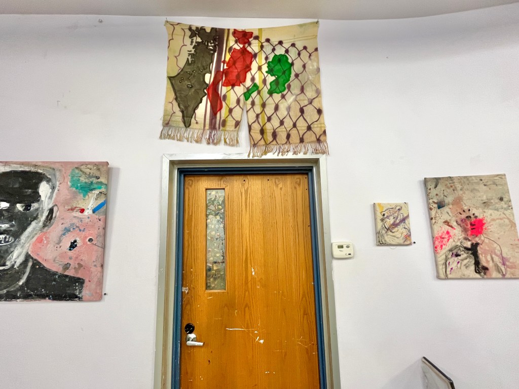 Zim Syed’s pop-up show at the Irma Freeman Center for Imagination, (Zim Syed) Legal Defense Fund, opened on March 1st at the Unblurred First Friday in Bloomfield. The show, loosely subtitled “A Show About Staying Out of Jail,” was held before the recent pro-Palestine protests in Schenley Plaza on March 2nd. Syed, a young Pittsburgh-based artist and activist, stated that an unnamed company has accused him of erecting a Palestinian flag on their roof. This accusation has resulted in several felony charges against Syed.
