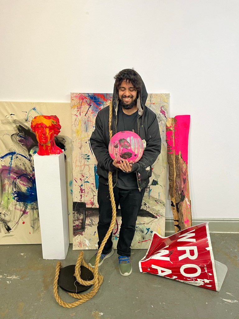 Despite the playfulness of Syed’s work, there is a serious undertone. Syed was imprisoned for his alleged actions. The show presents both lightness and darkness. Syed’s art is a powerful reflection of his mental state as he navigated through various events. His canvases are raw and unrefined, much like his emotions during those times. The unsteady brush strokes and paint splatters on his works evoke a sense of chaos and unpredictability, almost as if the artist was trying to capture the essence of his inner turmoil of bucking the system yet possibly having his own criminal record. Syed’s style is reminiscent of the illustrations of Ralph Steadman, the celebrated artist who worked on Hunter S. Thompson’s Fear and Loathing in Las Vegas. His artwork both entertains and inspires contemplation.