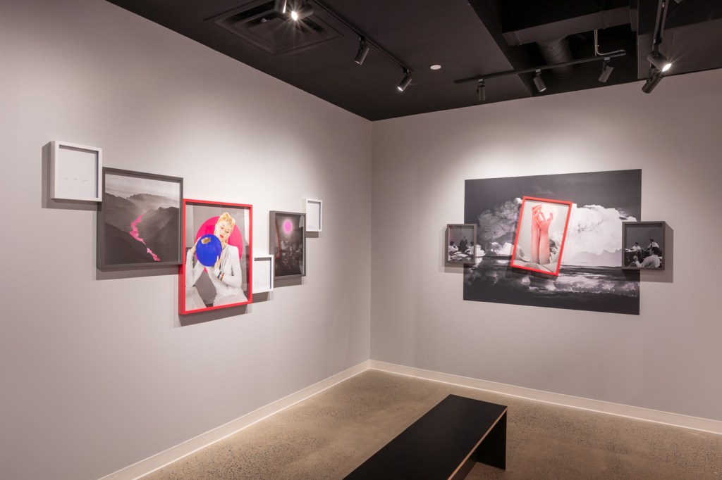 You are met with vibrant colors upon entering the space—exciting hues of yellow, pink, purple, blue—which add not only a welcomed juxtaposition to the black and white images taken up by the artists, but nicely foreground the duo’s central aims for their exhibition: the rewriting of a specific chapter within art history—a 1955 photo exhibition titled The Family of Man executed by Edward Steichen. Today, this exhibition is often discussed as embodying photography’s historical tendency to depict subjects through a privileged viewfinder. This subversive reimagining of segments of Steichen’s oeuvre demonstrates collage’s powerful capacity for acting as a tool for cultural critique, as well as its ability to illustrate new possibilities.