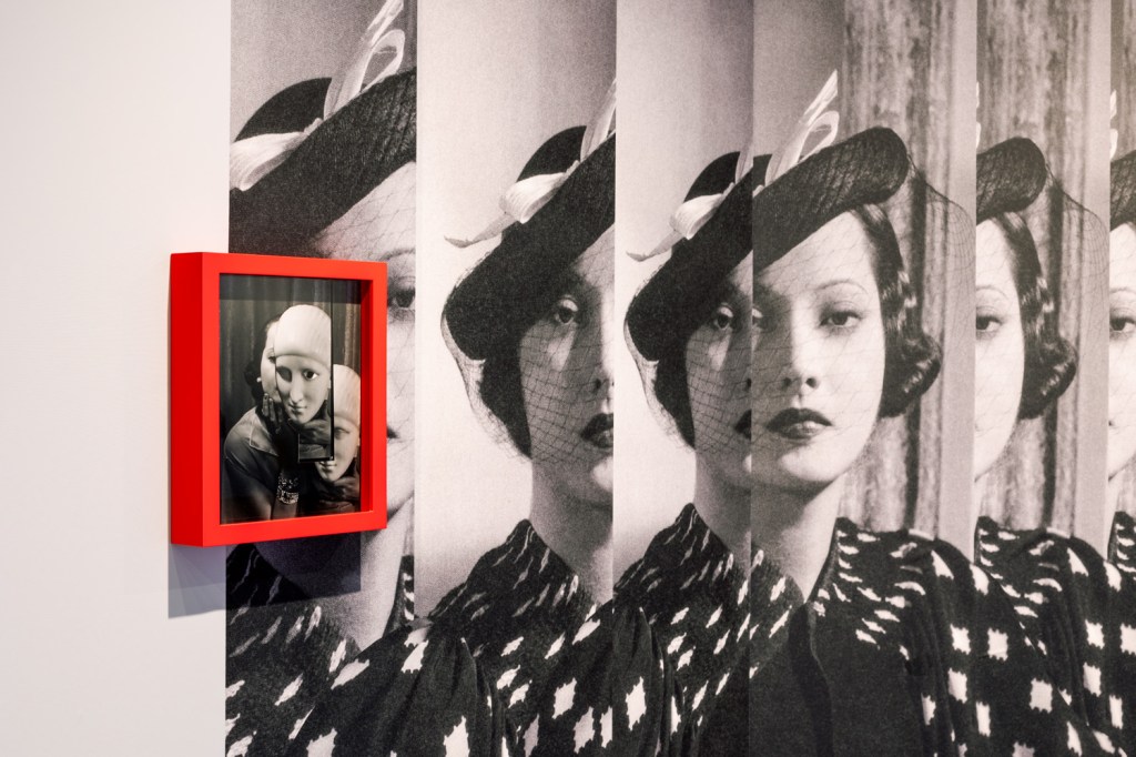 Vinyl wall prints are deployed throughout the exhibition and help extend the work beyond the frame—a cheeky way of moving beyond the confines of historical frameworks that makes the work feel almost monumental; the reworked images rise to meet the viewer, offering bold new truths. Woman Gazing I coupled with Truth Appearing (both 2022) are one such example; the former features a black and white image of a seated, colorized white woman inquisitively peering through an empty frame, with the eponymous text of the latter work posited to the right. Both pieces work in tandem to investigate the tenuous nature of “truth” that has been historically determined by men. It offers a speculative reimagining of what may be found beyond these structures.