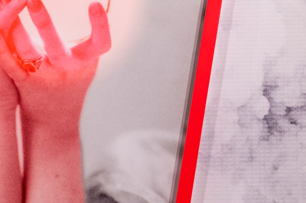 Gaze uses fragmentation to break up a portrait of an expectant mother across five black and white rectangles. Separating the woman’s protruding torso from the rest of her body plainly speaks to the current sociopolitical moment. Spending time bearing witness to her decidedly unemotional expression reveals a groundswell of complex emotions lying close to the surface; the work is arresting and stark.