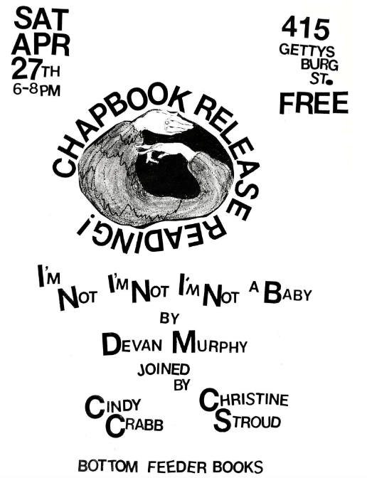 Wanted to give a shoutout to Devan Murphy, writer, artist, and Petrichor contributor based in the city who just released her chapbook I’M NOT I’M NOT I’M NOT A BABY and will be having a reading on 4/27 at Bottom Feeder Books.