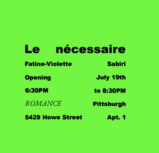 However, if you missedthat show, Kross has another one coming up this very Friday (fast de-install turnaround! Go Margaret!): Fatine-Violette Sabiri’s Le necessaire. Love this poster, too.