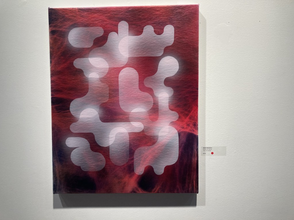 Why is your phone so dark? If I had a dollar for every time I answered that, I would be rich. Or, anyone who’s ever tried to watch a movie on my laptop has gotten confused by the pervasive sepia tone reminiscent of the Mexico scenes in Breaking Bad. I have “dark mode” on essentially all the time to prevent eye strain from blue light. This might be a futile exercise. But “dark mode” is a very cool name for something. And John Burt Sanders’ Dark Mode at Zynka Gallery is anything but dark. I got to the show at 7 and at least a quarter of the paintings had been sold. Little red dots abound. Clearly, the work resonated, and I found myself wanting to spend more time with the paintings to feel them out further.