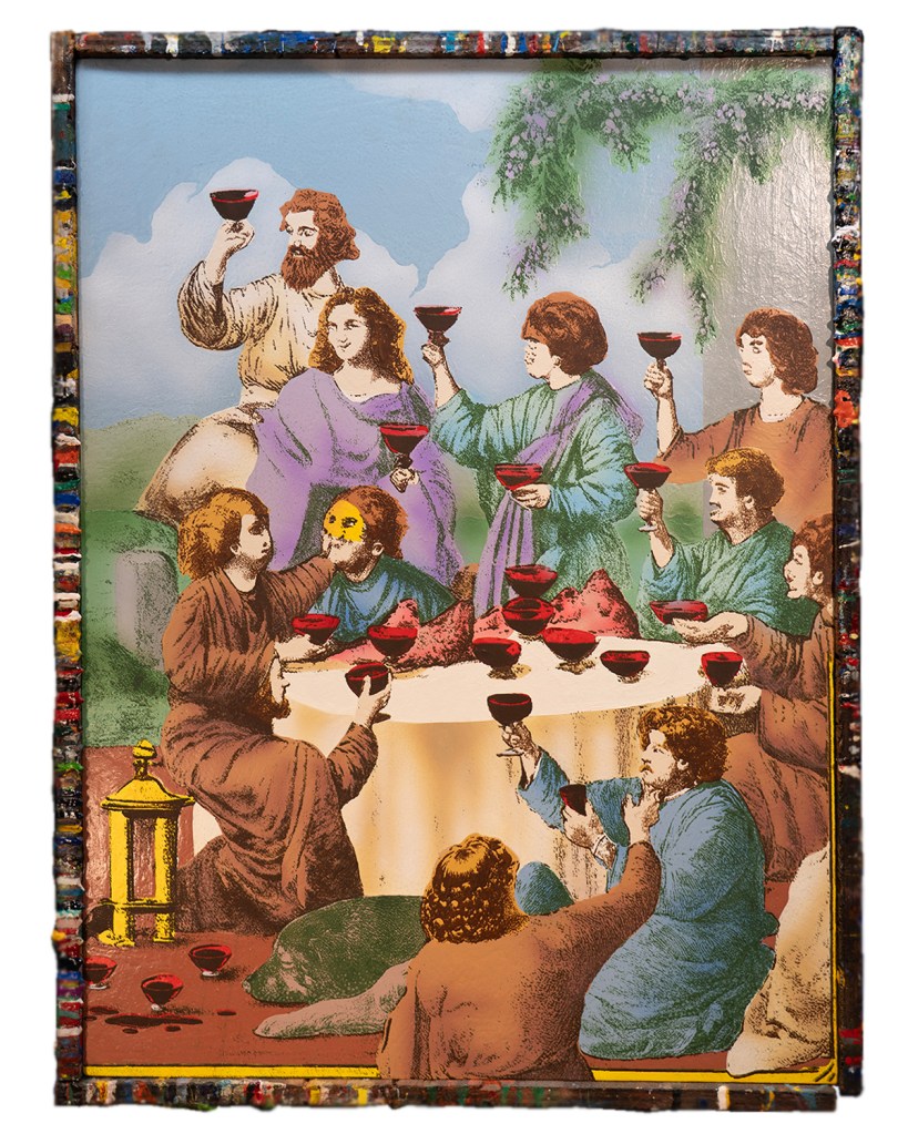 Bitcoin Revelry offers another view of the hedonistic get-together, featuring stacks and platters of golden disks being shared; the Bitcoin logo is lifted up like a communion wafer during Catholic mass. This visual stand-in for the digital currency appears like the spread of McDonald’s food Trump has served to guests at the White House. Those in attendance express looks mad with greed, their contorted faces revealing not one ounce of humanity — only blank, carnal consumption.