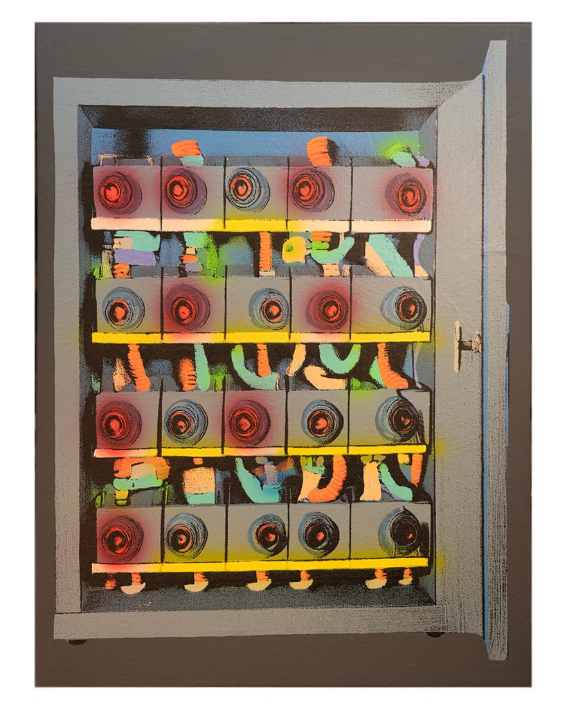 In Killswitch I–III, color emanates from the digital cogs of the machine’s backend interface, glowing and saturated, imbued with vitality from the feathered, misty veil cast by the airbrush. This is not a digital essence, but a warm, human presence — the energy of human creativity; human meaning; human life-force; a consciousness. It is slurped up by the computer brain, consumed and rehashed as it tries to make sense of what it is not. The product? A digital composite, a facsimile of humanity. For now, it is vomit; in a year from now, it may be truth. For now, Regal is still in control.