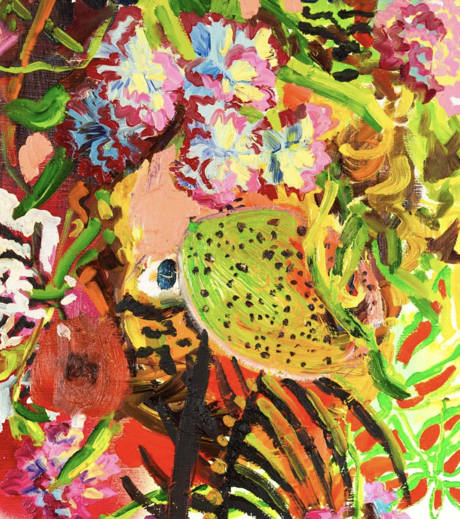NW: Unseen Pearl was made in 2011, right after I graduated Yale, and it’s the only painting in the show that wasn’t made in 2025. Just before installing the show it occurred to me that I was thinking a lot of figures hiding or emerging from a kind of jungle of plants or jungle of paint, and I remembered making a painting just after graduate school that was the first time I expressed this idea using a glimpse of a human figure rather than only animals or invented creatures. At the time I painted it I considered it a self-portrait. Jeff was excited to see the painting when I pulled it out of storage and he asked if it had been shown before, which it hadn’t. He suggested including it in the show, and I loved this idea of connecting with my younger self in this way. Now however, I think of the figure as less of a self portrait and more of an ‘everyman’ symbol, a representation of the hidden gem inside each of us. It’s a painting about fear and optimism, a theme in a lot of my work. Offspring has a similar connotation despite completely different imagery— a startling litter of kittens— perhaps startled themselves by the gaze of the viewer, and also representative of the fecundity of life, the fertility of creativity.