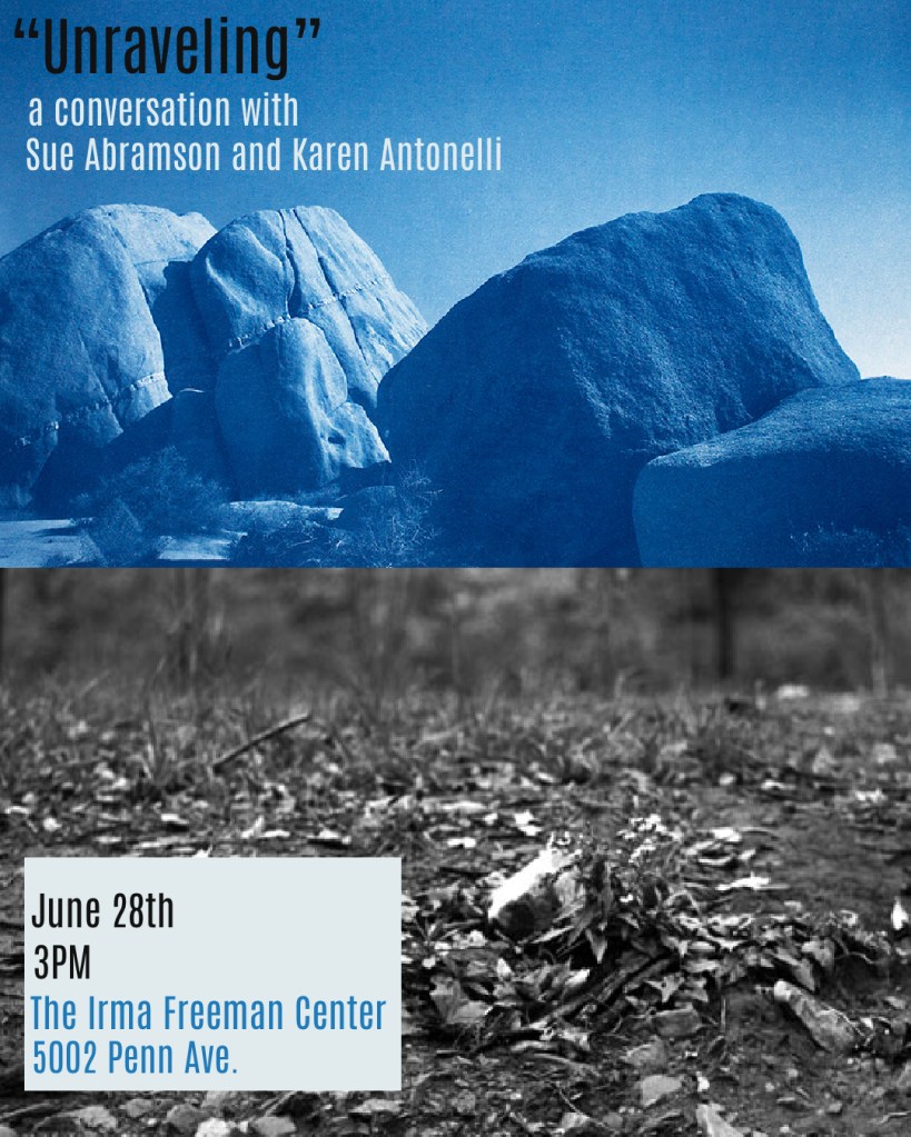 During June’s First Friday I ducked out of the scattered rain into the Irma Freeman Center for Imagination, and was greeted by a wall of stunning, large format cyanotype landscapes amid complex and moody carbon prints. The exhibition, Unraveling, presents the work of two legendary Pittsburgh photographers — Sue Abramson and Karen Antonelli.