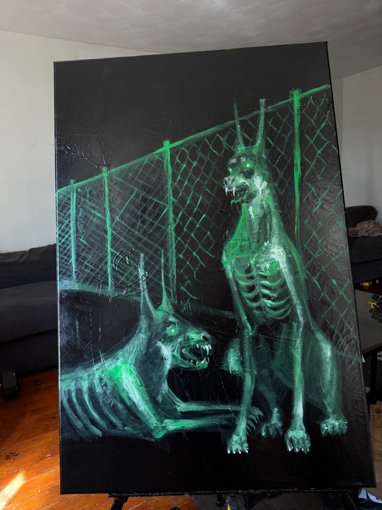 I loved the hellhound or Doberman-looking dogs that showed up in the work in your recent show. How do symbols like that appear in your paintings?