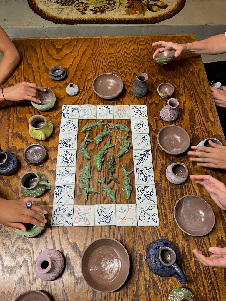 Midway through the show, Sultan took extra work out of the kiln and rallied us around the central table to explain her technique. She had been experimenting with applying Batik methods on ceramics to create chip-away glaze that revealed pre-waxed patterns applied hours beforehand. The others around me immediately grabbed gloves and began scrubbing away at individual works, and I soon followed suit, but rather hesitantly. As I glanced at the others’ finished pots, I was met with high contrast and clear designs, unlike the crackled lines in my own hands, stemming from an inability to press down any harder than a light caress.