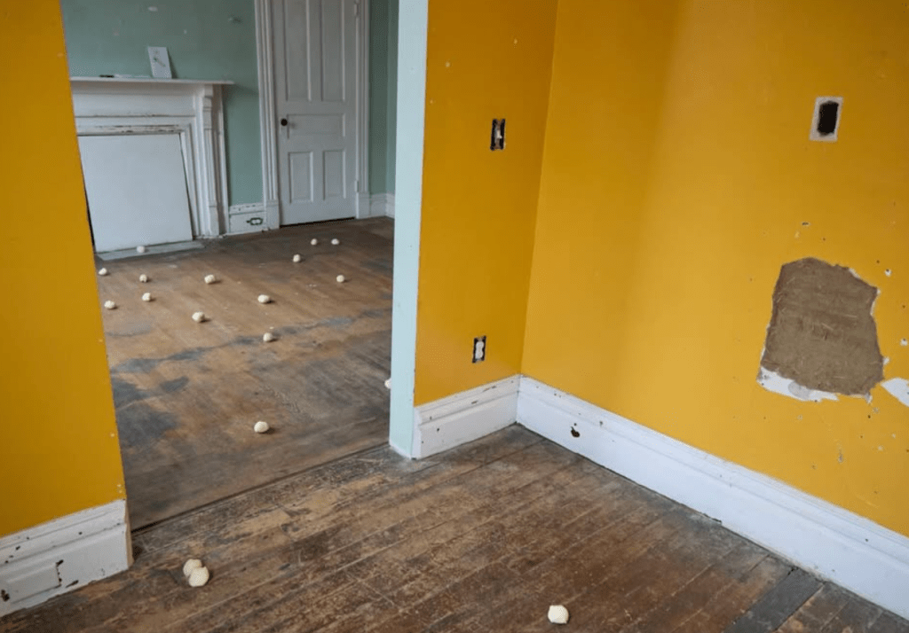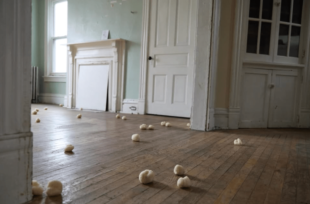 A recent performance by artist Cole Modell titled “*Sticky Rice with Zero Spatial Awareness” at (____), the experimental art space at 843 Holland Ave, centered on the live manipulation of sticky rice makes this tension visible. Over the course of about twenty minutes, the artist rolled and tossed rice spheres across the floor, remaining mostly in one position, occasionally shifting his body to redistribute coverage in the space. To an unprepared viewer, the action may have appeared minimal, even arbitrary. People asked how he found the space, as if surprised that anyone would permit something so apparently minor, even silly, to occur there. Without reading the accompanying text, many viewers had little sense of what they were witnessing.