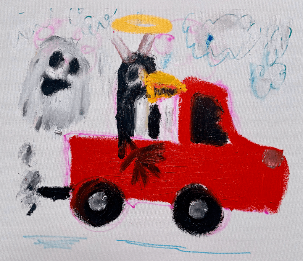 So, when I’m told “a child could paint that” I laugh, cause they’re not wrong, and in a way they’re wrong. If they don’t have the imagination, or the thought of going back to when they were a kid, they couldn’t do it. For years I was trying to paint more realistic art, portraits, and such, but that wasn’t me. Even as a kid I wanted to draw things how I saw them and they never came out exact.