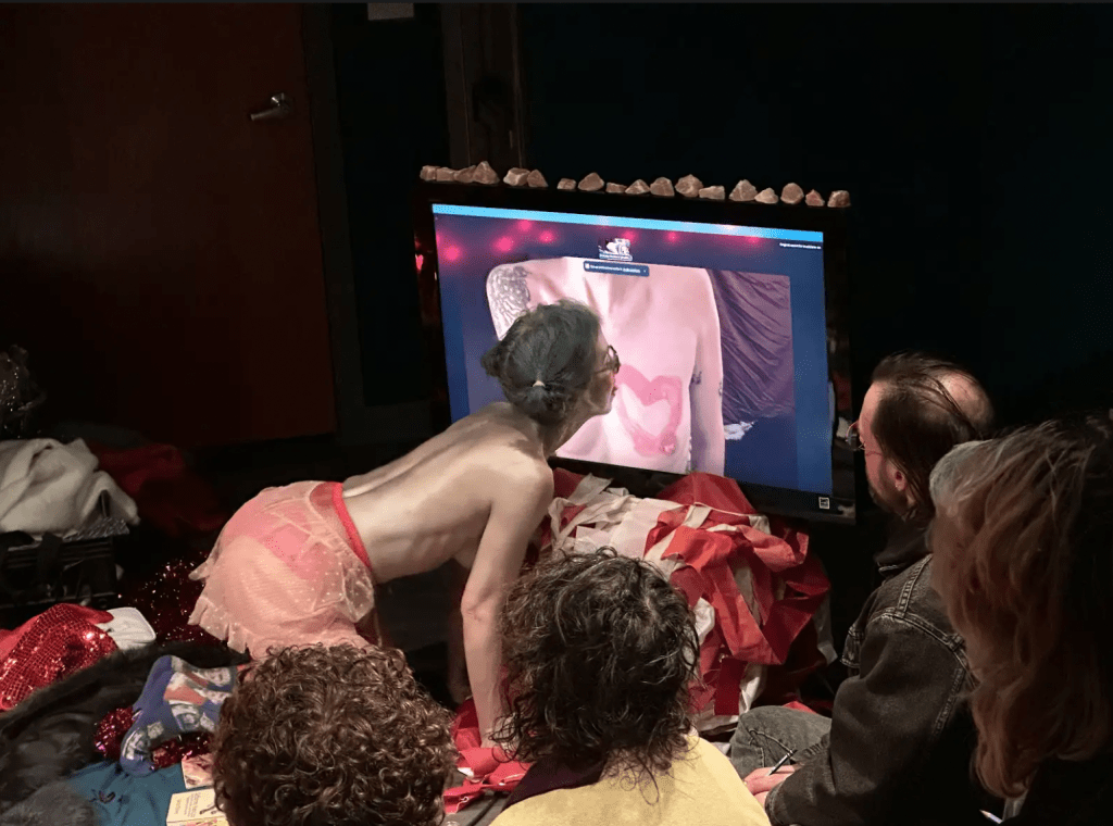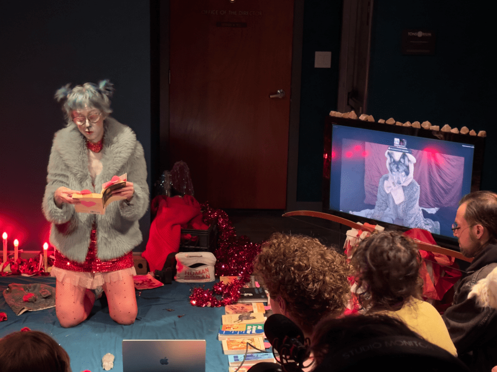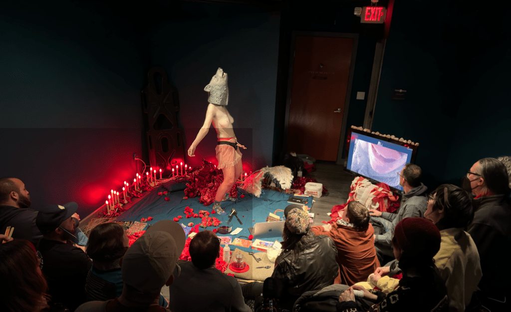 There was a section of the performance I thought of as ‘Sexy Tuunbaq’, where the artist donned a plastic wolf tongue strap on, doffed her top, and put on a vertically oriented rubber wolf mask, gyrating with an intensely long canine neck like an impossible arctic terror, licking the TV screen while her silver-screen back rippled in the theatre lighting of the ritual space. Intimate telepresence is awkward, adorable, a game of trying. “You’re teasing me” she says as she kisses glass with rippling light beneath it, Luci’s image flattened to the screen.