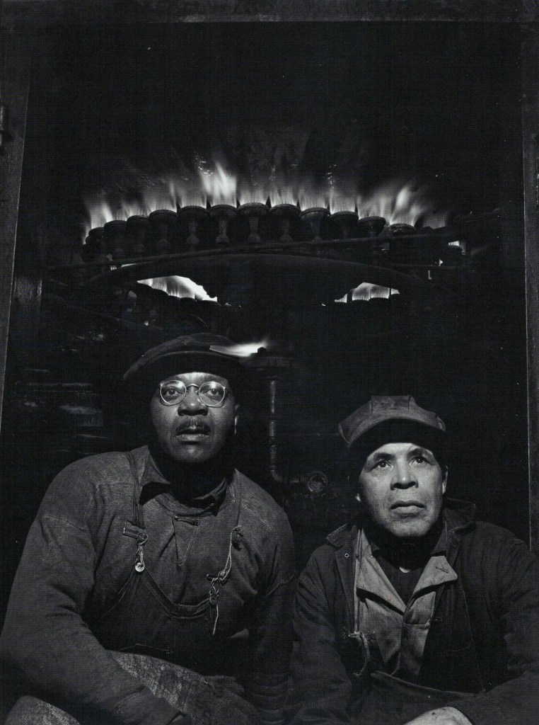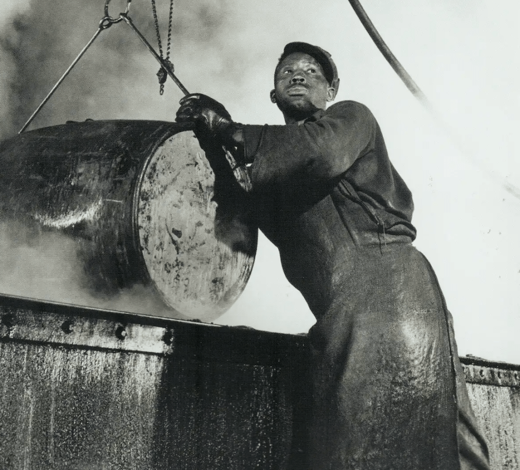 Cover image: The cooper’s room where the large drums and containers are reconditioned. Here a workman lifts a drum from a boiling lye solution which has cleaned from it grease and dust particles. Gordon Parks, 1944.