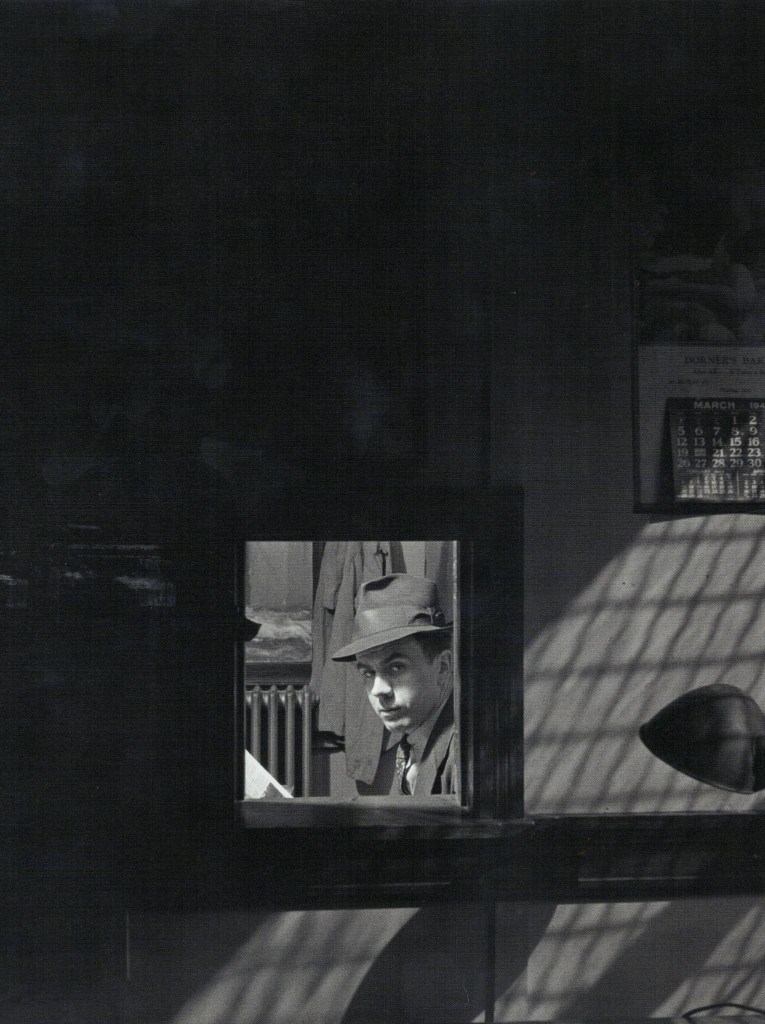 Only white men occupy the upper echelons of the plant, the well-appointed offices far from the shrieking, smoking machines. Chief engineer A. B. Knight is photographed in his private room, wearing a suit and tie with a crisp fedora on his head. Most of the photo is cut diagonally with stark, film noir shadows; we spy a calendar and a desk lamp lurking at the dim edges. Knight looks at us through a small square porthole, the sort of counter you prostrate yourself before at a DMV or hospital waiting room. He’s shrouded in darkness and photographed at a remove, unlike Parks’ proletariat close-ups, looking like a weary private eye. His eyebrows are slightly, ironically arched, and he gives us a side-eyed glance. He looks cold. He’s telling us: “Go away, don’t bother me.”