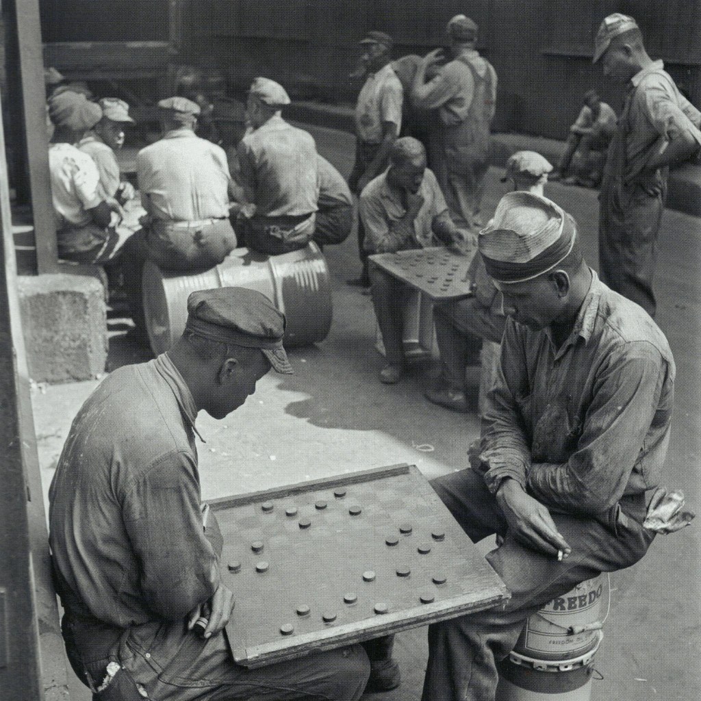 The workers don’t have comfortable chairs to rest in; they don’t have chairs at all. In Parks’ photos of workers on break, they congregate at a random patch of concrete outside the plant, sitting on wooden boxes and barrels and overturned oil drums. Some of them stand because they can’t find a seat at all. The workers play checkers with one another, and it took me a second to realize that the checkerboards aren’t placed on tables—because there aren’t any tables. A pair of workers face each other and rest the board on their knees, the rough wood digging into their trousers. These are the people who actually manufacture the material the company profits from, yet the company can’t even give them a few picnic tables to sit at.